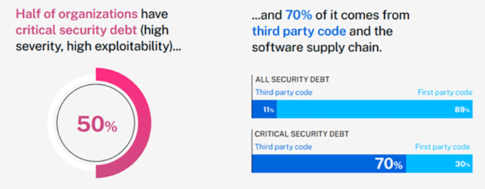 - Open-source debt: Leading organizations keep open-source critical debt under 15 percent, while 100 percent of critical debt is open source in lagging organizations.